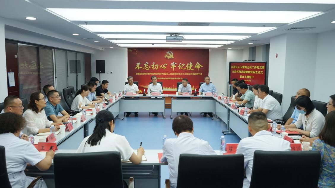 7月20日,为深入学习贯彻落实自治区第十三次党代会精神,自治区人大常委会法工委党支部与自治区药品检验研究院党总支开展联合主题党日,围绕“贯彻落实自治区第十三次党代会精神,助力‘六特’产业发展”活动主题进行学思践悟、互动交流,自治区人大常委会副主任沈凡、av视频 党组书记、局长王生礼等领导同志以普通党员身份参加了此次主题党日活动。
