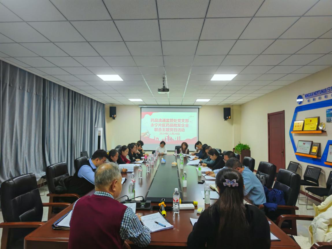 为深入学习贯彻自治区党委十三届九次全会精神,教育引导党员主动融入全区全面深化改革大局,全力以赴投身“百日攻坚战”,11月26日,药品流通监管处党支部组织永宁片区药品批发企业开展了“学习自治区党委十三届九次全会精神 推动药品流通行业高质量发展”联合主题党日活动,支部全体党员和8家药品批发企业的负责人、质量负责人共18人参加了活动。