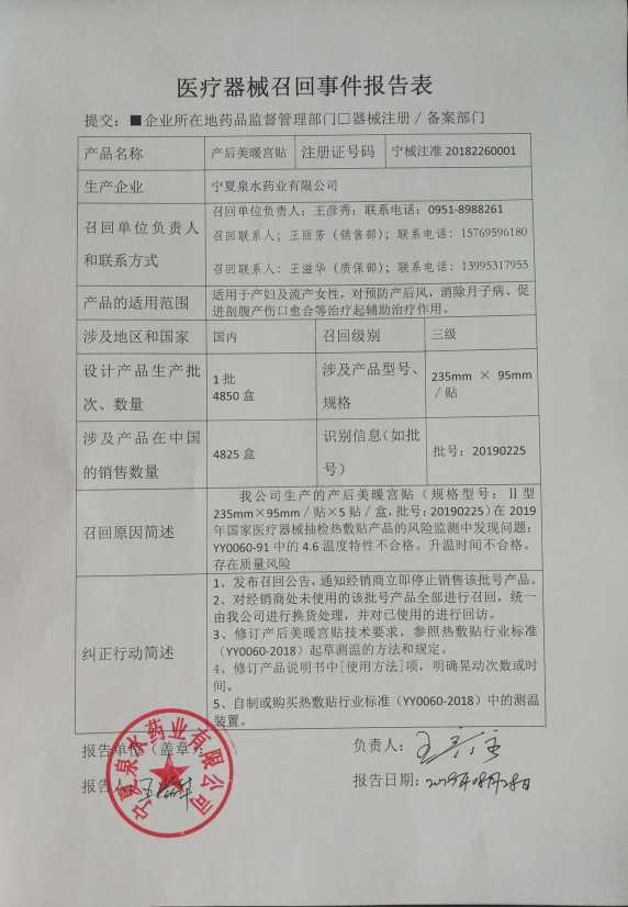 宁夏泉水药业有限公司报告,由于涉及产品升温时间不符合标准要求,该公司对产后美宫贴(注册证号:宁械注准20182260001号)主动召回。召回级别为三级。涉及产品的批号、规格及批次等详细信息见《医疗器械召回事件报告表》。
